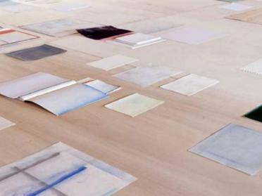 The papers are staged based on a balance between the traces dating from before their discovery and the artist’s later additions. Both evidence and a sign of passage, 3 semaines follows a particular sequence while summoning multiple media and artistic histories. Cardboard and paper marked with ink, eraser, and chalk evoke traditional materials. The artist adds innovations by using dust and cement. She seeks to evoke a sensory experience by adding her own imprint to these papers’ history. Their different arrangements on the floor suggest a synaesthesia with the materials. The familiar process of drawing is brought into question, as the artist explains that “here, drawing is done in a series of gestures”—collecting, sorting, filing, arranging in an administrative order. The recovery of these discarded and abandoned papers reveals man’s omnipresence in a natural world that has been altered, or even exploited.