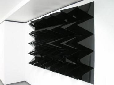 Based on the repetition of abstract geometric forms, the composition of this large panel is structured around a succession of black conical shapes. At first glance, the function of this wall device remains obscure, but the comparison of the work with a technological machine gives it its full meaning: indeed, Anechoic Wall is reminiscent of anechoic chambers, experimental rooms whose walls are covered with foam or fibreglass dihedrals to absorb sound or electromagnetic waves. While the other sculptures in Laurent Grasso’s series are made of copper, wood, or marble, this installation is made of black steel, a material chosen for its brilliance. The reflection of light responds to the absorption of sound, allowing the sculpture to call on different senses. In addition to its intrinsic aesthetic quality, the work conveys the idea of passing from one state to another, between the audible and the inaudible, the visible and the invisible, the material and the immaterial.