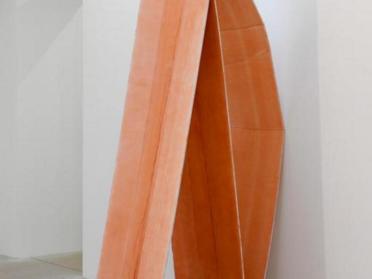 Gyan Panchal recovers his materials in the manner of Arte Povera artists, using factories, building sites, and nature as his main sources. The materials he collects then undergo a form of recycling in which the artist subjects the object to a randomized process in order to make a work of art. For Baubajai (2012), Gyan Panchal covered a foam board, a construction and insulation material, with hematite powder which gives it an orange appearance. The board, which is shaped by breaks and folds to create linear patterns, becomes a monumental abstract sculpture consisting of a sloping plane resting on a block that is itself leaning against the wall of the exhibition space. By presenting a work that connects the floor and wall, the artist frees himself from verticality and sculpture’s plinth.