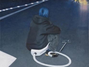 In this painting with hyper-realistic touches, Audrey Nervi documents an incongruous situation she observed during a rave. In the centre of the canvas, she has captured the posture of a blue-haired boy sitting on a white vacuum a few steps away from CRS riot police trucks. In the larger continuum that the work suggests, numerous silhouettes are outlined in the warm light of a car’s headlights. In contrast to the agitation of this mass of bodies at the edge of the canvas, this individual seems to have been captured unwittingly in this calm pose. Isolated, he has been designated by the artist—not without irony—as The Cleaner, no doubt because of his peaceful demeanour—the only way to end the chaos. Here, Audrey Nervi sets him up as a symbol, referring to an entire marginalised section of society which, in her painting, takes on an entirely different status.