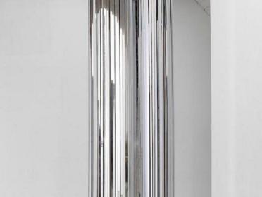 Tarik Kiswanson designed this polished steel sculpture for a solo exhibition at the Collège des Bernardins in Paris. The oblong and tapered shape of this large sheet metal mobile responded to the vaulted ceilings and Cistercian architecture of the former sacristy. The artist spent several weeks polishing these metal strips for them to take on the appearance of a mirror and reflect their surroundings. He sought to create a special relationship between the imposing architecture of the sacristy and the body and the gaze of the spectators, who are invited to enter the sculpture and play with the lines of mirrored steel to see their own reflection multiply. This suspended sculpture exerts a strange attraction that owes much to the ambiguity of its form and its title Father Form: at once light and enveloping, it invites us to take refuge in it as if in a cocoon, while its long, tapering metal blades evoke a kind of futuristic cage or prison.