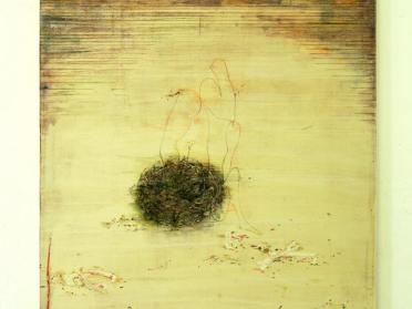 From an abstract composition which simply highlights the raw grain of the supporting wood, Niels Trannois brings out faintly sketched anthropomorphic limbs and an accumulation of tangled dark lines. He induces a discrepancy between the abstract representation and the title I will give you a name, which reduces the creative act to “giving a name” to one’s production. The artist delivers an enigmatic creation that introduces textural effects through the use of various materials. He plays with the contrasts between language and the sensation produced by the work, abstraction and narration, representation and emotion in a painting that is also evocative of the surrealists.