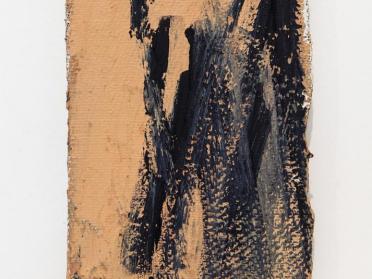 Lydia Gifford's works, experienced in their performative thickness, oscillate between monochrome painting and sculptural presence through the combination of modest and sometimes unusual materials: cardboard, fabric, towels, carpet, gesso, wax, ink, pigment, oil, clay, and nails. The artist proceeds in successive layers through a deeply physical process, experimenting with the resistance of the media in order to produce anthropomorphic forms endowed with thought and feelings. Echoing its title, Jump plays with its rough, unbleached surfaces to create haptic sensations by exalting the traces of gestures on the burlap canvas. Its irregular frame exposes the saturation of the fabric fixed intuitively by nails, translating the porous barrier between inside and outside. Often suspended in the studio, these works are then placed in a broader pictorial field within a site-specific context, questioning the temporality and scale of the human body between the horizontal and the vertical.