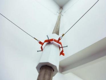 Made of reinforced concrete, steel, and raw oak, Plugin-Rhyzome is an expression of tension. The cables that criss-cross the piece extend out from an octagonal cylinder fixed to a column. In this way, the work sculpts the space in which it is located. Faced with the lightness of the networks it creates, one almost forgets the weight of the materials chosen by the artist. Ethereal, the work appropriates elements usually used in architecture to “occupy a space and define it” (Marie Chênel), in a manner reminiscent of Richard Serra’s work and the theories of Rosalind Krauss. The work “plugs in” and, by imposing itself on the exhibition space, reveals and transforms it. Despite its monumental scale, Plugin-Rhyzome can be dismantled and transported from one space to another to generate new spaces and question our relationship to them.