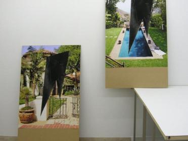 Contemporary to the Miroirs Noirs series (2008), Untitled explores visual artefacts by transforming geometric cut-outs from magazines into enigmatic flat black surfaces that the artist has created through superimposition by spray painting the following pages. The result, which plays on the mechanical interference of image production, is then digitised, printed in large format, and partially affixed to a diptych of medium wood panels leaning against the wall and distributed at different heights along a staircase. Here, the stereotypical media representation of idyllic interiors is disrupted by a process of partial obscuring, suggesting their smoothness and superficiality. By drawing on the diverse flow of images (Internet, press, film), Clément Rodzielski significantly alters its materiality to question our representation of the world, adding the series Grands a like a swansong to an art that can now be perceived as symbols.