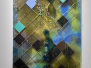 The painter Kerstin Brätsch and sculptor Debo Eilers have been producing works together under the name KAYA since 2010. KAYA functions as an entity in its own right, beyond the individual practices of the two artists. At the crossroads between visual and performing arts, KAYA’s work breathes new life into old objects from daily life, ceremony or ritual— furniture from the shared shower room of the artists’ studios, graffiti, S&M objects, coins, etc. Unit 3D (Pure Rok) represents at once a see-through resin shower stall and stained glass, with its enamelled colours. The diamond pattern also evokes a Harlequin costume. At once painting, sculpture and partition, this hybrid work offers a fresh, dripping, and unusual take on a presumably hygienic space.