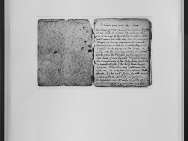 To Charm Guns and Other Arms is a heliogravure reproduction of the first page of a prayer book, prayers for protection that Joseph Bernes, a gold prospector from Saint Lucia who came to Guyana in the 1930s, patiently copied down so that he could live in peace in the Amazon rainforest. Traces of this prayer can be found in a collection published in 1820 by John George Hohman, and its sacred character is enhanced by the technique of heliogravure printing, which echoes light as a manifestation of the divine presence in Christianity. The prayer originated in the Creole Christian Pow-Wow theology practised by the indigenous populations of Pennsylvania and repressed between 1880 and 1934. The work is part of Mathieu Kleyebe Abonnenc’s multidisciplinary approach as an artist, researcher, exhibition curator, and film programmer, as well as his decolonial approach. His subjective approach as an artist raises this text to the status of a work of art, bringing out of oblivion a cultural testimony which had been almost entirely suppressed until the end of the twentieth century.