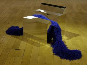 At first glance, On Edge is a boa with bright blue feathers that appears to be floating, when in fact it is lying on a parallelepiped whose material reflects the space surrounding it. These two objects conceal and reveal each other by disturbing our gaze. The geometric rigidity is confronted with the softness and sensuality of the boa. Through a certain theatricality, this assemblage interacts with the space where it is located and with those who encounter it. As the work is constantly changing, an infinite number of images can be applied to it. This restlessness is the strength of Delphine Coindet’s work, thwarting norms and conventions, in particular those of a certain masculinity associated with minimal art, by imposing “the notion of doubt as a value in itself", in the words of the artist.