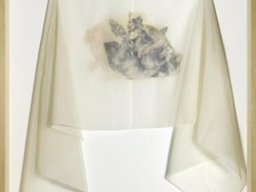 “It’s my own Holy Shroud, my own lie!” says Jean-Luc Verna of his series of transfers on fabric. In these works, the drawing is photocopied and then transferred onto a veil with the help of make-up before it is fixed to the wall with large folds. The ambiguity of Mieux qu’à Naples lies in the interplay between the prosaic nature of the subject and the spiritual symbolism of the medium. The scene depicts a satyr, a lustful and perverse mythological figure known for his drunkenness. While contemplating a mask representing his own face, the man with goat’s legs and pointed ears copulates with another creature in a relationship of domination and submission. This erotic image, which appears to present the sexual act as a subterfuge, at first sight seems to be at odds with the mystical aspect of the textile, which recalls Saint Veronica’s Veil, which bore the miraculous imprint of Christ’s face. Emblematic of Jean-Luc Verna’s mixture of genres between the sacred and the profane, Mieux qu’à Naples is a complex layering of symbols and diverse references.