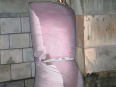 In this contemporary still life, Audrey Nervi paints a portrait of a trivial object she found in a Parisian street. The absence of a human figure focuses the eye on the appearance and colour of this form that sits majestically in the centre of the canvas. Probably deemed to be useless or out of fashion, what appears to be a discarded item acquires a new meaning through the artist’s pictorial work: the detail of the adhesive tape on which the inscription “I love you” appears in red capital letters highlights the importance of this object to which a new status has been conferred. Against the backdrop of our political and social reality, the seemingly trivial presence of this form takes on meaning and becomes evocative. Overcoming the divide between what deserves to be represented and what does not, the canvas bears witness to the rejection of those who live on the fringes of society but who find refuge in Audrey Nervi’s works.