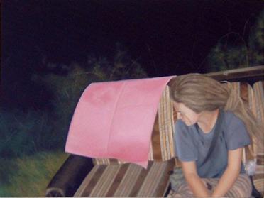 Here, Audrey Nervi endeavours to recreate a memory of her Italian sojourn by depicting a young girl named Viviane whom she met there. From a candid photograph taken during her travels, the artist meticulously transcribes the posture of the protagonist represented in the foreground, sitting on a sofa in the outdoors. The realism of the scene shows the young woman in the glow of a flash that seems to surprise and blind her. This artificial light also reveals the surrounding environment: a forest plunged into darkness that could refer to the fringes. Seemingly almost swallowed up by what lies beyond the frame, Viviane seems to be on the verge of “stepping off-screen”, reflecting her lifestyle on the margins of society.
