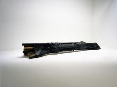 The installation The body of the river knows no boundaries presents four rifles, recognizable by their butts, wrapped in a rifle rag. The grease that impregnates the textile gives the impression of having mummified these obsolete objects through time. Laurent Montaron exhibits these relics of a past history in the same way as the most precious objects in museums. Here he conceives an “image-object” that questions the relationship between the work and the viewer. The deliberately enigmatic title reflects the importance the artist places on the interpretation of the meaning of his works. Indeed, he conceives his titles as so many clues to be brought together to grasp the global meaning of his work.