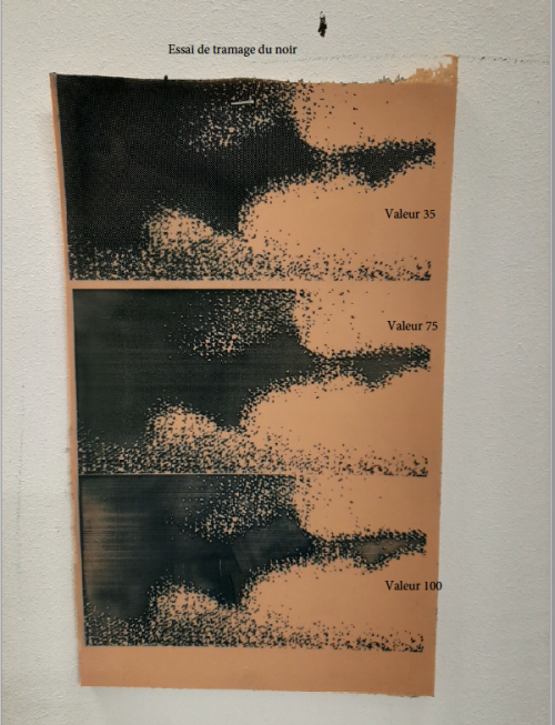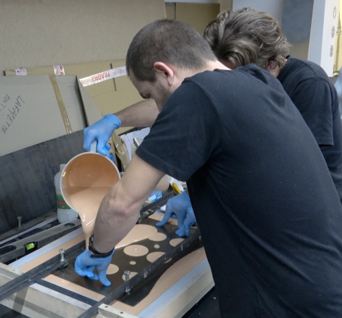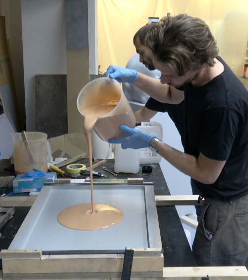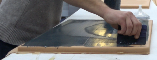 On enlève l'encre projetée au laser. Le silicone conserve l'impact de la projection créant ainsi un épiderme sur la plaque.