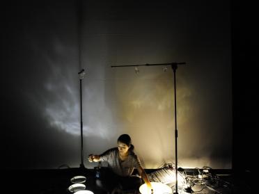 In 2006, she attended a concert of Aanayampatti Ganesan, a virtuoso of Jalatharangam – the traditional Carnatic music instrument with water-filled porcelain bowls. Fascinated by the simplicity of its device and sonority, Sauvage immediately started to hit China bowls with chopsticks in her kitchen. Soon her desire of immersing herself in the water engendered the idea of using an underwater microphone and led to the birth of the electro-aquatic instrument.