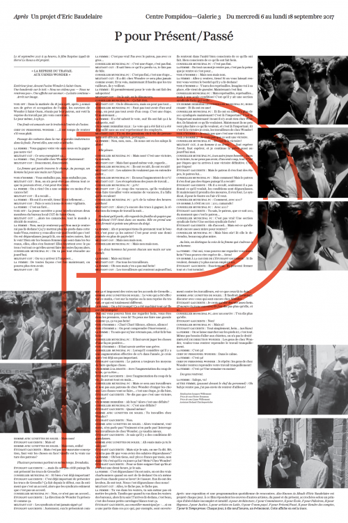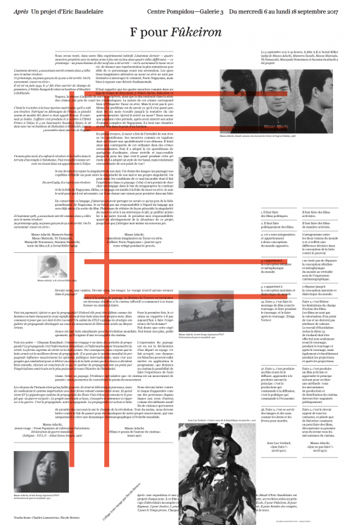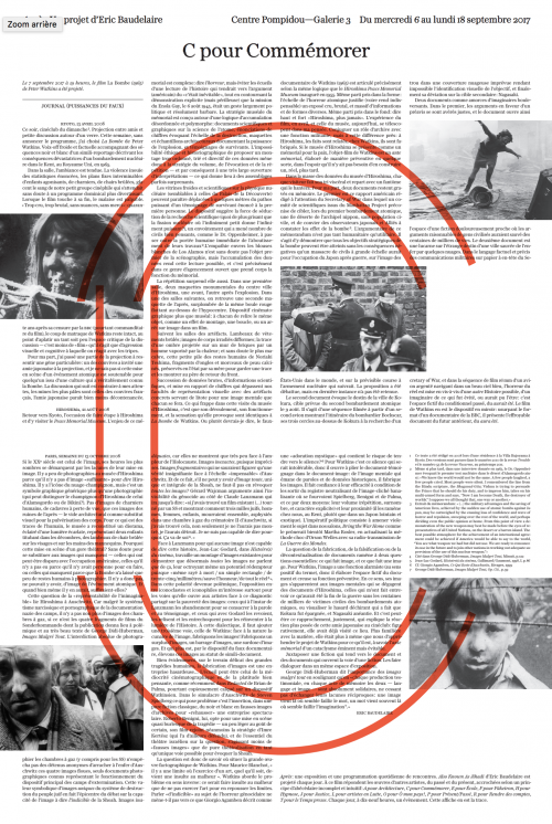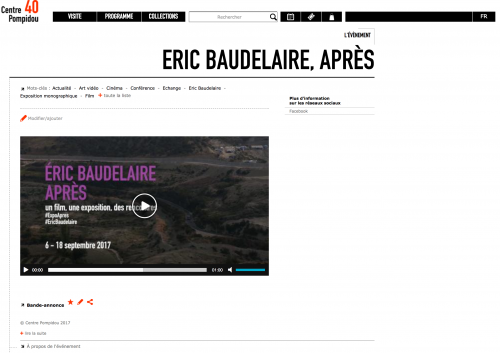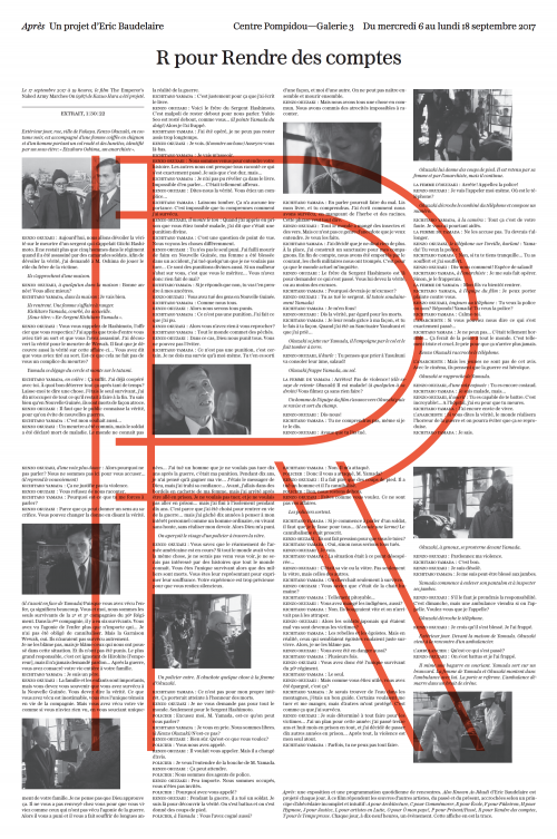 En 2017, Éric Baudelaire et la commissaire d’exposition Marcella Lista ont, douze jours durant, transformé la Galerie 3 du Centre Pompidou en lieu de projection, forum et espace d’exposition. À rebours des discours politiques et médiatiques tentant d’élucider les attentats du 13 novembre 2015, Éric Baudelaire a réalisé le film Also Known As Jihadi, portant sur l’histoire possible d’un homme parti rejoindre le Front al-Nosra en Syrie. Il compose dans celui-ci un récit sur les paysages architecturaux, politiques, sociaux et judiciaires où s’est déroulée cette histoire. Chaque soir, les rencontres organisées exploraient d’autres paradigmes, œuvres canoniques du XXe siècle à l’appui, pour sortir de la sidération de l’après-attentats et des insuffisances explicatives du djihadisme. Éditées à la fin des échanges, les douze affiches présentées dans l’exposition font état de ces réflexions.