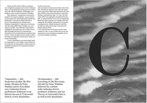A pour Architecture ; C pour Commémorer ; E pour École ; F pour Fukeiron, la théorie du paysage ; H pour Hypnose ; J pour Justice ; L pour artistes en Lutte ; M pour Mouvement-image ; O pour Ô mon pays ! ; P pour Présent/Passé ; R pour Rendre des comptes ; T pour le Temps presse.