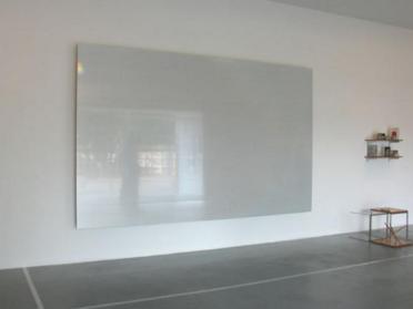 Issu de la série du même nom, Brume est un monochrome abstrait réalisé à partir d’aluminium recouvert d’adhésif holographique. Ce matériau banal généralement employé pour les panneaux de signalisation routière confère à l’œuvre son caractère iridescent pour sensibiliser sa surface aux jeux de lumière et de reflets tout en l’ouvrant à son environnement. Brume reflète et enregistre de manière éphémère les mouvements des visiteurs dont elle livre une vision trouble et embrumée dans un lointain écho aux tableaux de paysages du XIXe siècle auxquels l’œuvre emprunte son format et son titre. La mise en scène du vide qu’opère ici l’artiste rappelle également les White Paintings du peintre américain Robert Rauschenberg (1925-2008). À travers un processus de détournement caractéristique de la pratique de Saâdane Afif, le panneau routier est vidé de tout signe et laisse place à un paysage embrumé en perpétuelle transformation qui évolue en fonction de ceux qui le regardent.