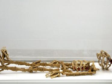 Un squelette humain dont les os sont formés de biscuits pour chien et les organes de tranches de bacon : c’est ainsi que se conçoit la sculpture de Michel Blazy. Des matériaux alimentaires, habituellement destinés à la consommation courante, sont ici détournés de leur fonction pour former un modèle anatomique. En convoquant les éléments de la nature morte comme la figure du squelette, l’œuvre s’apparente à une forme de vanité, symbole de la fragilité du temps et de la brièveté de la vie. Cependant, loin de proposer une méditation mélancolique sur l’inutilité des plaisirs de ce monde, l’installation affirme avec humour une pulsion de vie : elle change peu à peu de forme et de couleur au fil de son exposition, intégrant la part d’incongru, d’aléatoire et d’accidentel liée au processus de développement du vivant ou à l’apparition d’agents extérieurs comme les insectes. La sculpture développe ainsi son propre métabolisme, tel un écosystème se redéfinissant plastiquement et se renouvelant perpétuellement sans l’intervention du plasticien. Éphémère, l’œuvre de Michel Blazy est appelée à disparaître physiquement, mais aussi à durer virtuellement grâce à un mode d’emploi.