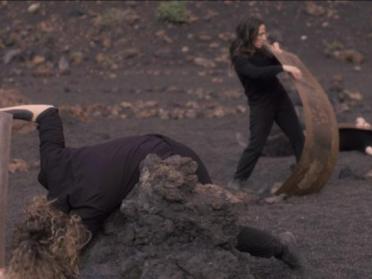 Dans l’installation sonore et vidéo Toutes ces filles couronnées de langues : les instruments, cinq « sculptures-instruments » – des plaques de cuivre équipées de composants électroniques et dispersées dans l’espace – captent et amplifient le son. À ce dispositif s’ajoutent deux vidéos projetées en simultané accompagnées d’une bande-son immersive. Elles sont extraites du court-métrage éponyme tourné sur l’île de Lanzarote. Le personnage principal, Estrée, se rend sur l’île de Kyrra où une communauté féminine a inventé un langage non verbal fait de gestes, de chants et de sons émis par les « sculptures-instruments ». L’œuvre interroge la possibilité d’un nouveau mode de communication libéré du langage quotidien, outil de domination hétéronormatif. En se déplaçant dans l’environnement sonore et visuel de l’installation, le spectateur est amené à se projeter dans ce récit, au sens propre – par son ombre – comme au sens figuré.