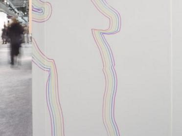 Untitled (Auric Outline, Liz) présente une silhouette dont les contours sont dessinés sur le coin d’un mur avec sept lignes colorées. Cette figure est légèrement inclinée, comme si elle cherchait à regarder derrière la paroi sans être vue. On retrouve ici certains motifs récurrents dans l’œuvre de Peter Coffin : la silhouette, qu’il utilise souvent pour suggérer des formes, et les couleurs de l’arc-en-ciel, qui évoquent aussi le spectre lumineux. Cette œuvre qui reflète le goût de l’artiste pour les pseudosciences fait référence à un concept ésotérique popularisé par le courant New Age, l’adjectif auric étant associé à l’aura, ce champ lumineux qui entourerait le corps des individus. L’artiste joue ici sur la frontière entre visible et invisible : la silhouette cachée derrière le mur est vue par le spectateur à travers son aura, supposée être imperceptible et décomposée selon les couleurs du spectre visible.