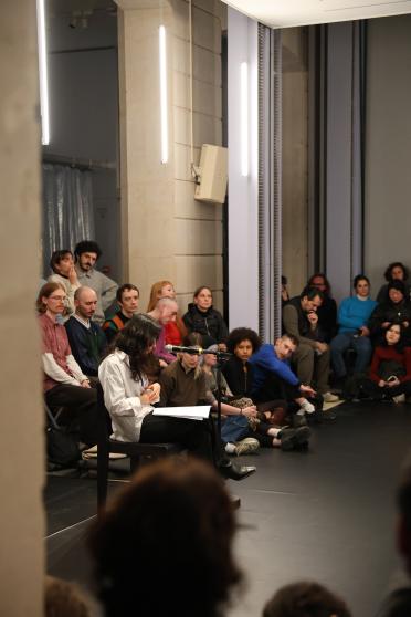 La performance est suivie d'une lecture par Line Ajan, membre du collectif Qalqalah, un espace de réflexion et de création transdisciplinaire qui interroge les questions de transmission, de mémoire et de récits minoritaires à travers l'écriture, la performance et la recherche critique.